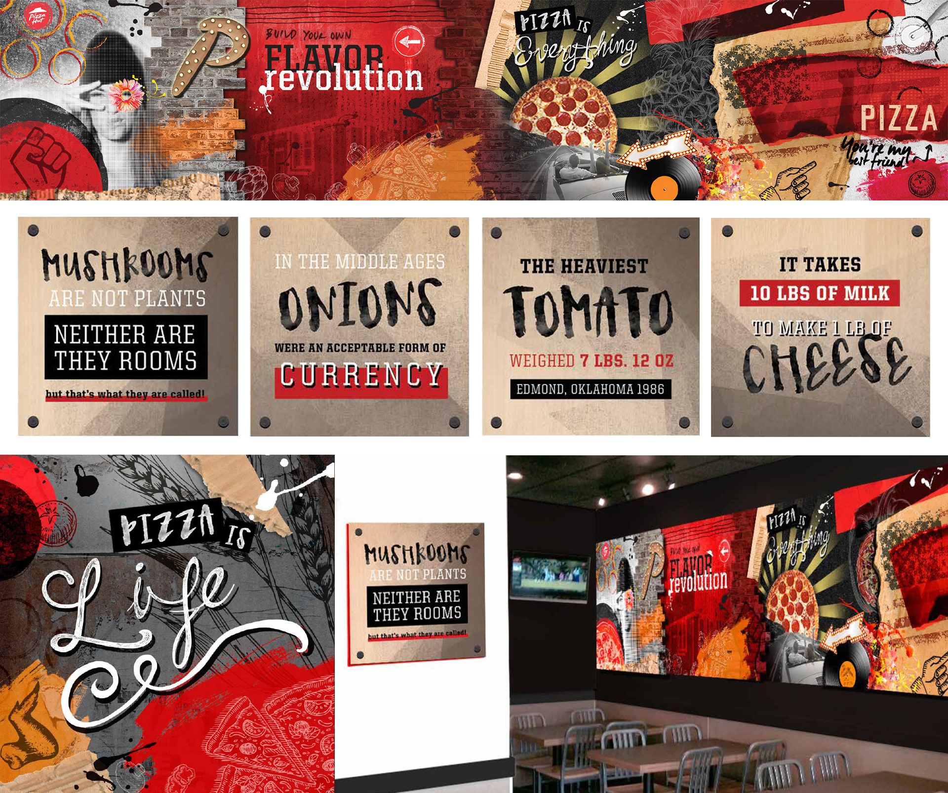 Wall art for Pizza Hut's dine-in restaurants. Collage art made of vinyl and sintra for a 3D effect with supplemental art in frames to fill the space depending on square footage.